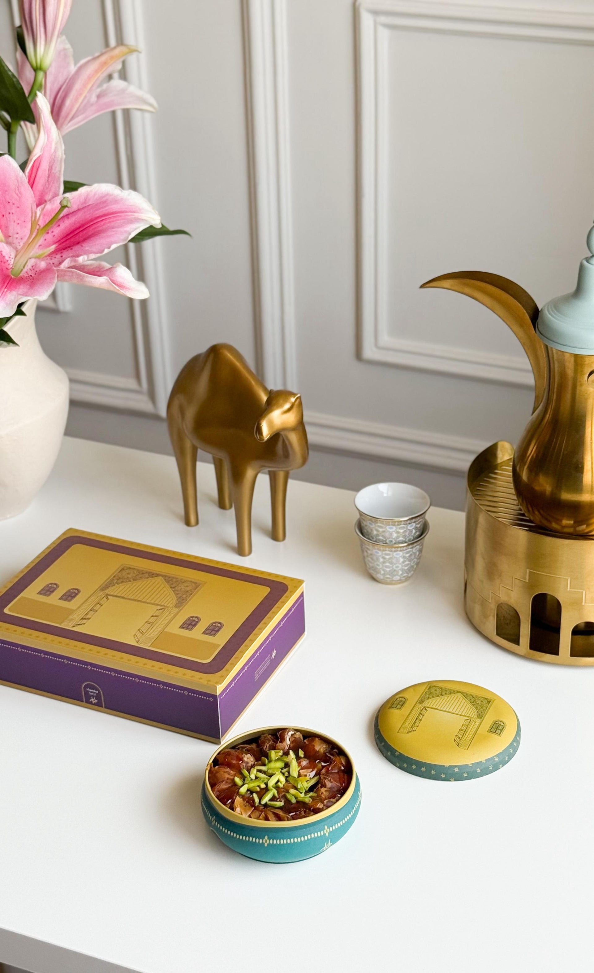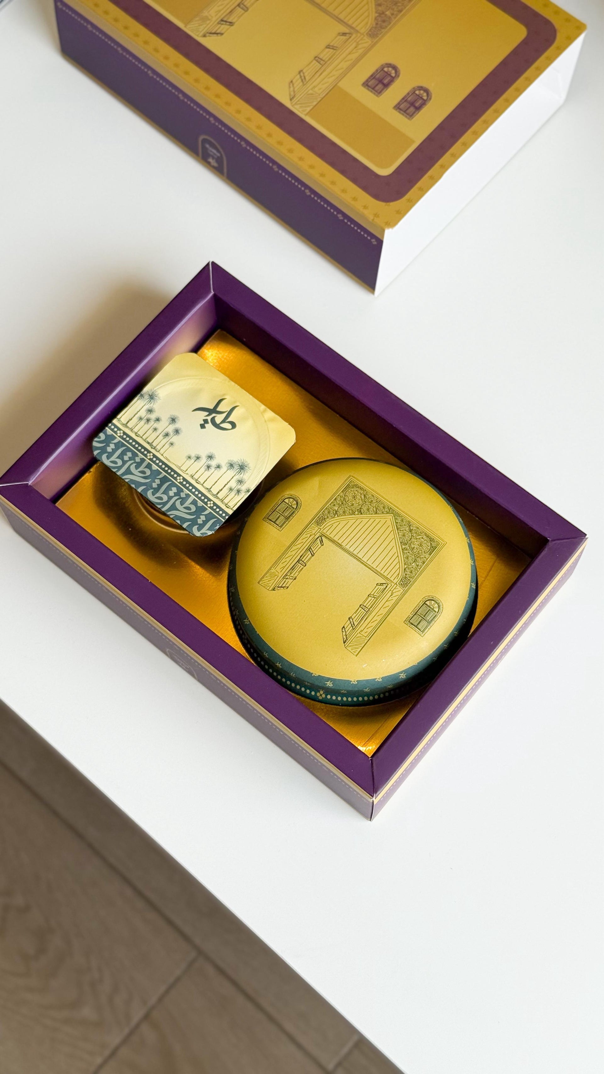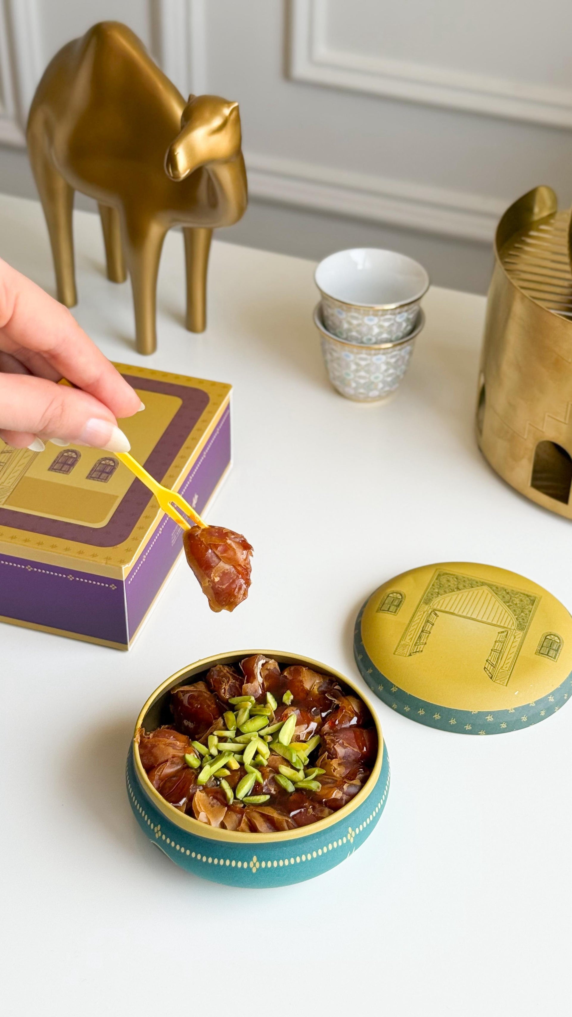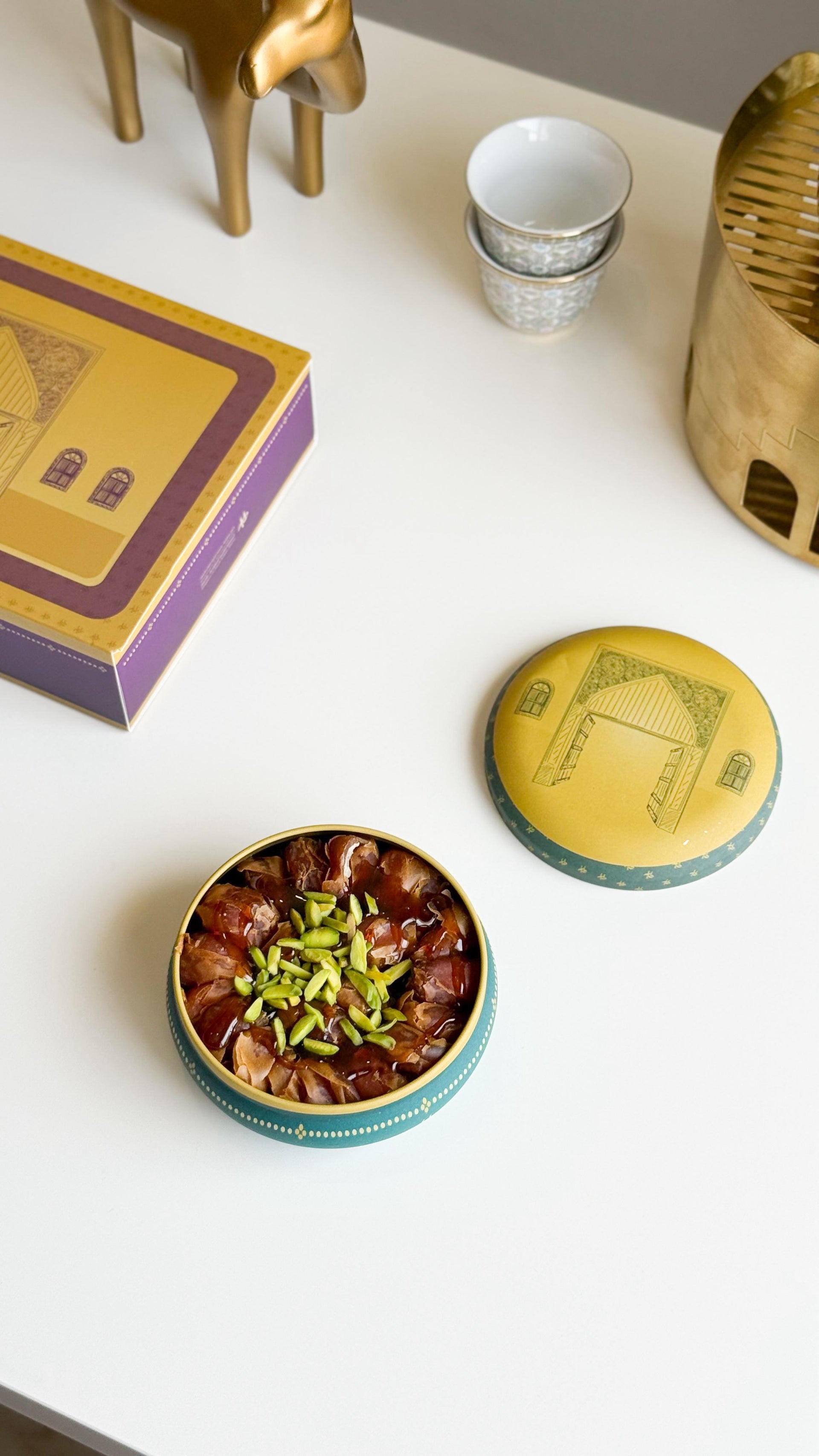 علبة خلاص محشي لوز مع الدبس والفستق تقدم بعلبة معدنية فاخرة